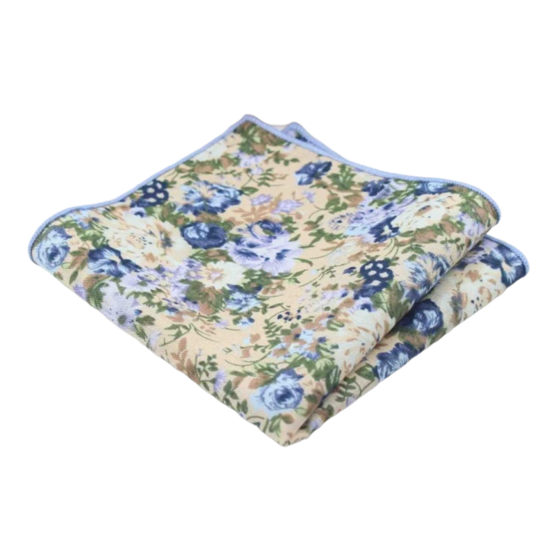 Béžový bavlněný kapesníček je potištěn modrými růžemi.