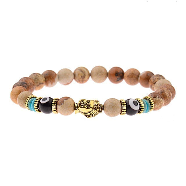 Popis: Stylový módní pánský i dámský náramek Buddha Etnic vyrobený z hnědobéžových korálků císařského kamene a doplněný zlatou hlavou buddhy.