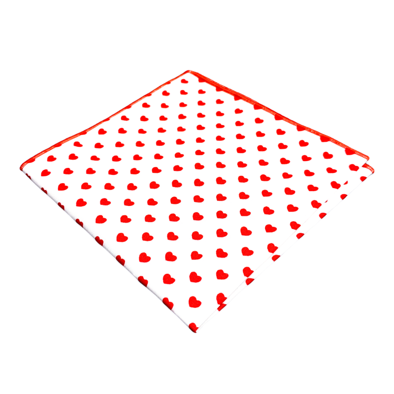 Bílý kapesníček je potištěn červenými srdíčky a obšit výraznou červenou nití.