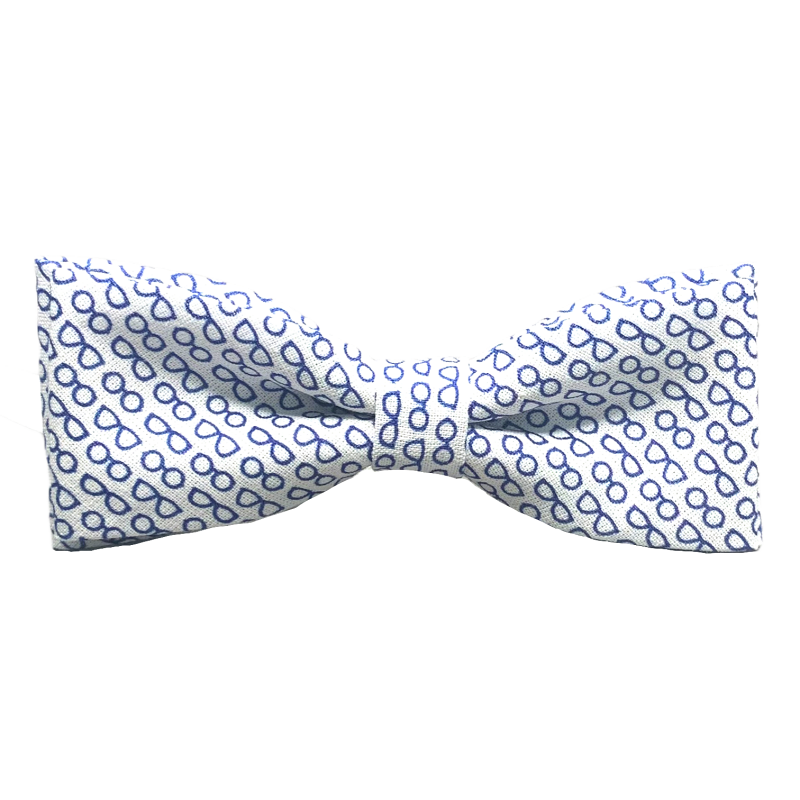 Popis: Kvalitní bavlněný bílý pánský a chlapecký motýlek s motivem modrých čirých brýlí.