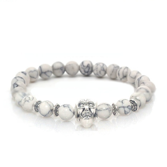 Popis: Stylový módní pánský náramek Lebka - Skull vyrobený z bílo - šedých onyx kamenů a doplněný stříbrnou Lebkou.