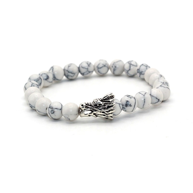 Popis: Stylový módní pánský náramek Drak vyrobený z bílo - šedých onyx kamenů a doplněný stříbrnou dračí hlavou.