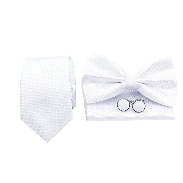 Bílý set kravata, motýlek, kapesník a manžetové knoflíčky Plaid