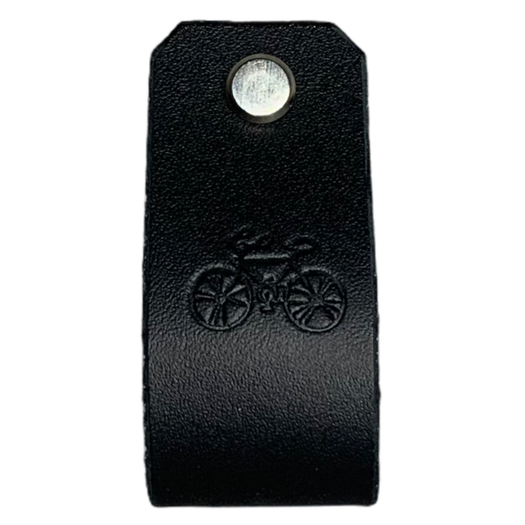Na přední straně klíčenky je v kůži vyražen bicykl.