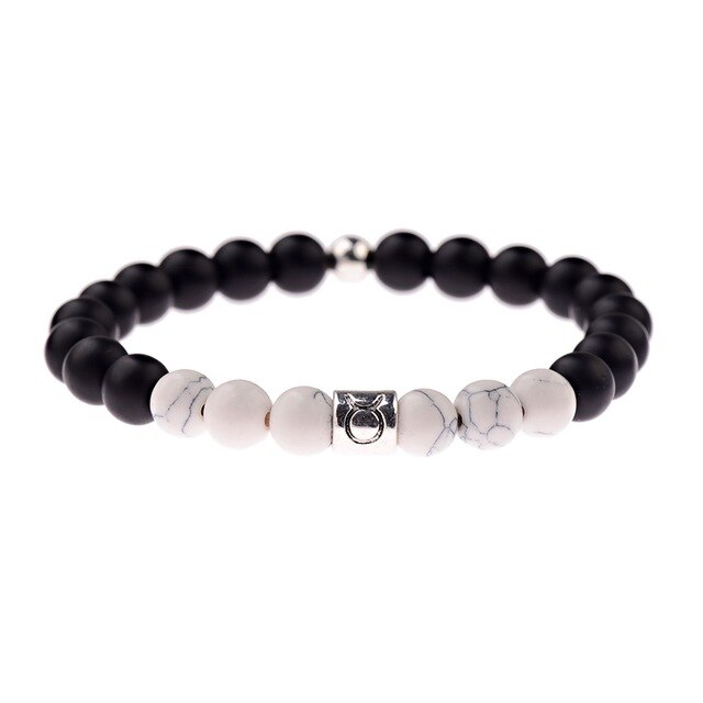 Popis: Módní černo - bílý unisex náramek znamení Zvěrokruhu - Býka, který je vyrobený z matně černých achátových kamenů, doplněný bílým tyrkysem a stříbrným válečkem.