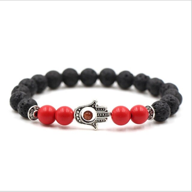 Popis: Stylový módní pánský a dámský náramek Fatimina ruka vyrobený z černých kamenů lávy, červeného onyxu a doplněný božím okem v dlani.