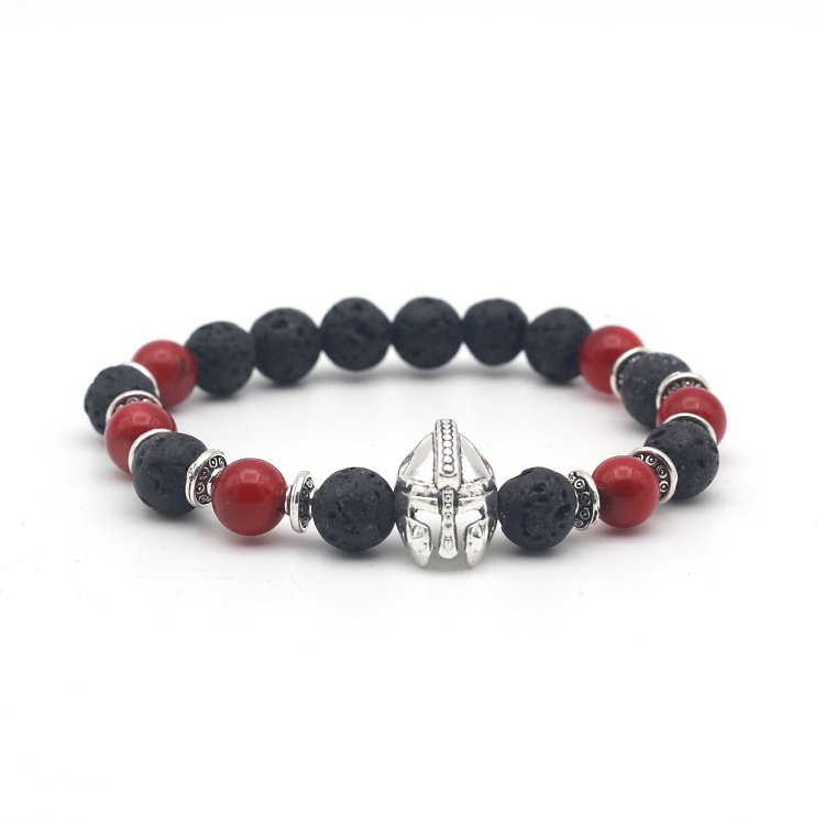 Popis: Stylový módní pánský náramek Sparta bojovník vyrobený z černých a červených kamenů lávy a doplněný stříbrnou helmou.