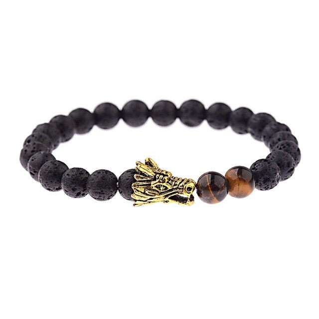 Popis: Stylový módní pánský náramek Drak vyrobený z lávových kamenů a doplněný zlatou dračí hlavou a dvěma kameny z tygřího oka.
