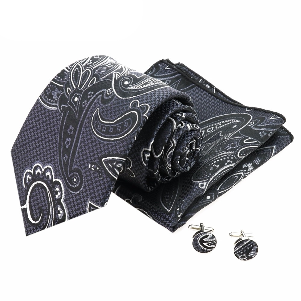Popis: Stylový módní pánský set v jednotném designu kravaty, kapesníku do kapsy saka a manžetových knoflíčků.