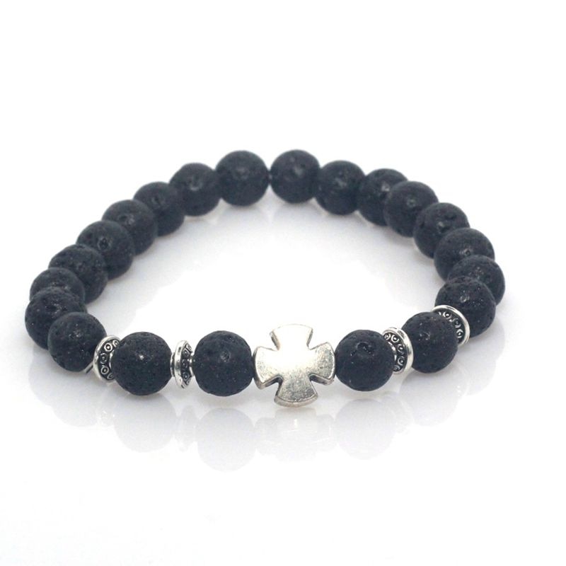 Popis: Stylový módní pánský náramek Kříž vyrobený z černých kamenů lávy a doplněný stříbrným křížem.