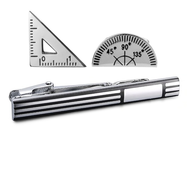 Popis: Luxusní černo - stříbrný set složený ze spony na kravatu a manžetových knoflíčků v designu Úhelníku a pravítka je stylovou třešničkou vašeho pracovního outfitu - Architekta.