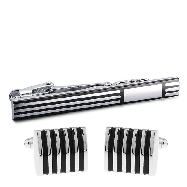 Černo - stříbrný set - spona na kravatu a manžetové knoflíčky Stripes