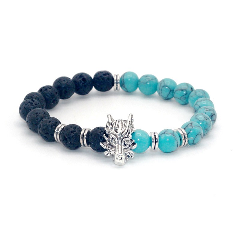 Popis: Originální dvoubarevný pánský náramek stříbrná Vlčí hlava vyrobený z černých kamenů lávy a tyrkysových kamenů onyxu.
