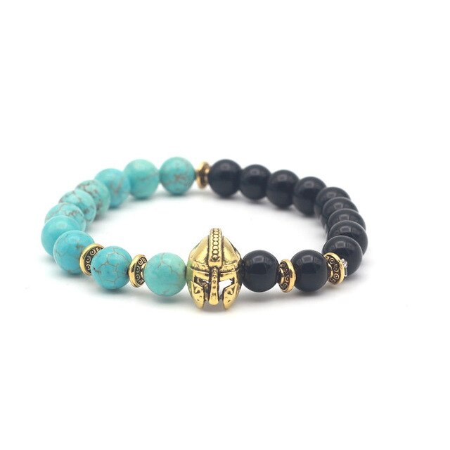 Popis: Stylový módní pánský náramek Sparta bojovník vyrobený z černých a tyrkysových kamenů onyxu a doplněný zlatou helmou.