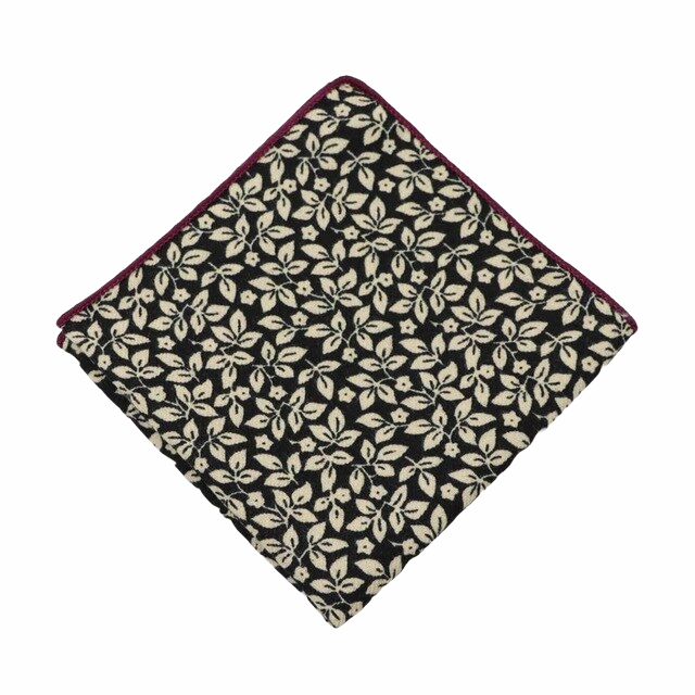 Kapesník je potištěn listy květin a doplněný kontrastním rudým obšitím.