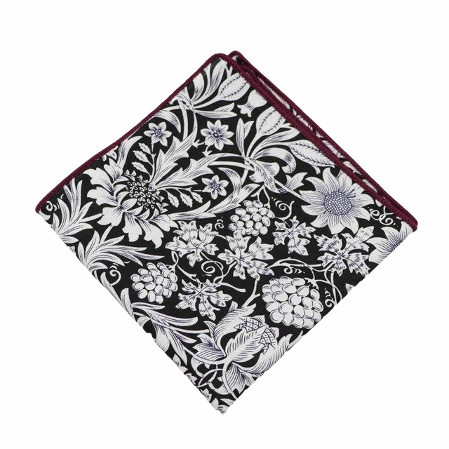 Kapesník je potištěn tropickým vzorem listů a květin. Doplněný kontrastním rudým obšitím.