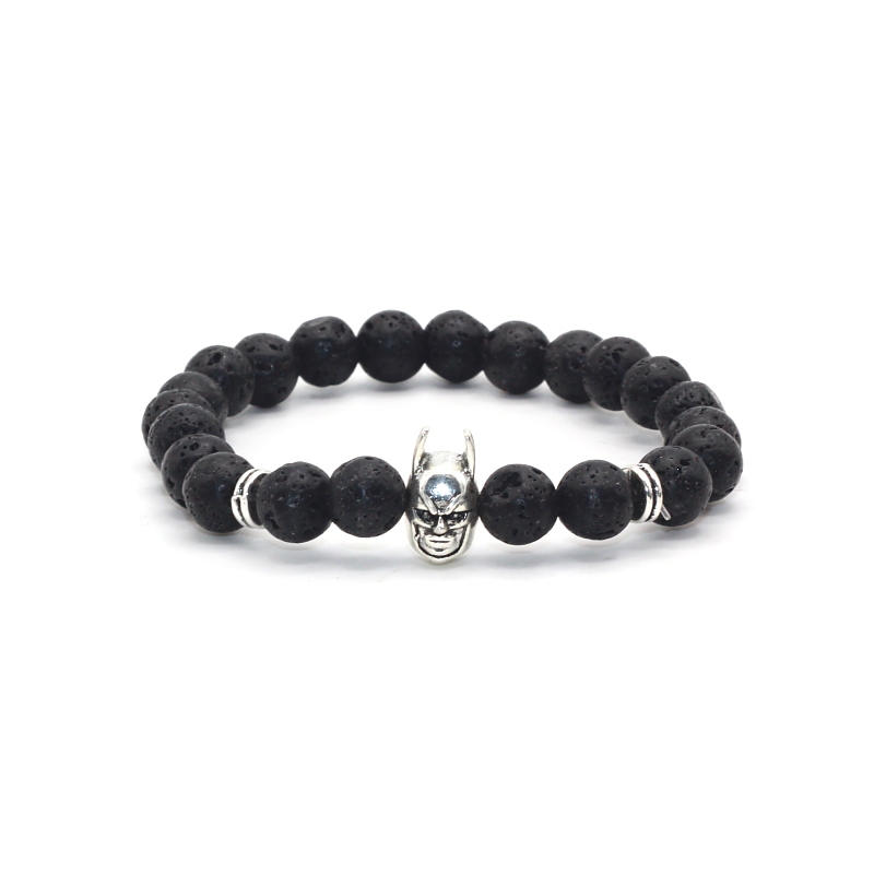 Popis: Stylový pánský náramek Bat vyrobený z lávových kamenů a doplněný stříbrnou hlavou Batman.
