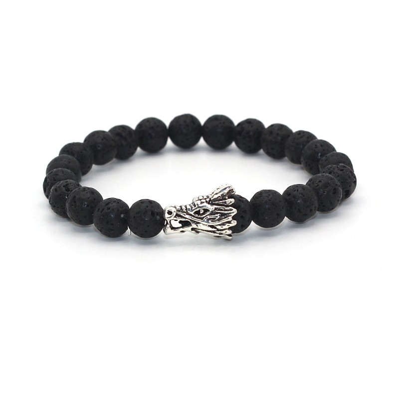 Popis: Stylový módní pánský náramek Drak vyrobený z lávových kamenů a doplněný stříbrnou dračí hlavou.