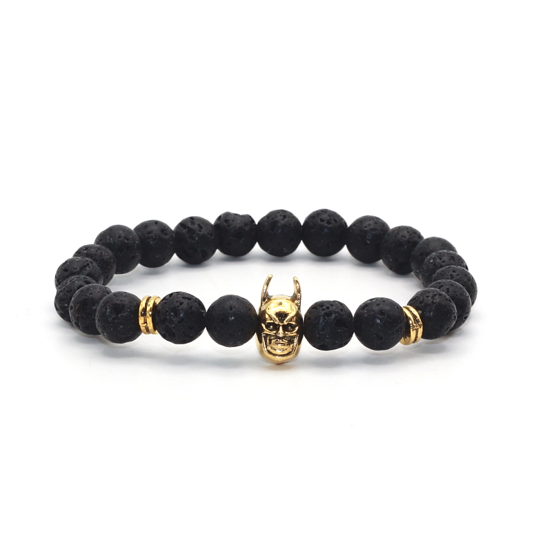 Popis: Stylový pánský náramek Bat vyrobený z lávových kamenů a doplněný zlatou hlavou Bat.