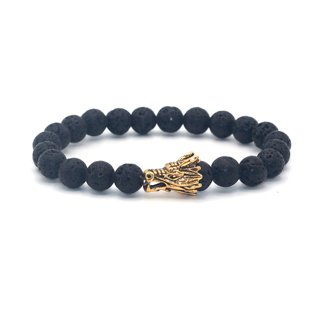 Popis: Stylový módní pánský náramek Drak vyrobený z lávových kamenů a doplněný zlatou dračí hlavou.