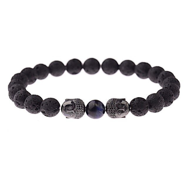 Popis: Stylový módní pánský i dámský náramek Buddha Lapis lazuli vyrobený z černých lávových korálků, doplněný korálkem z lapis lazuli a dvě tmavě šedé hlavy buddhy.
