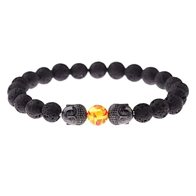 Popis: Stylový módní pánský i dámský náramek Buddha Resin amber vyrobený z černých lávových korálků, doplněný korálkem z pryskyřice jantarové a dvě tmavě šedé hlavy buddhy.