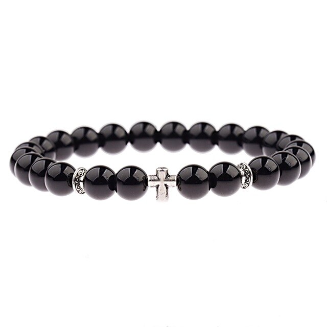 Popis: Stylový módní pánský a dámský náramek Křížek vyrobený z černých korálků a doplněný stříbrným křížkem.