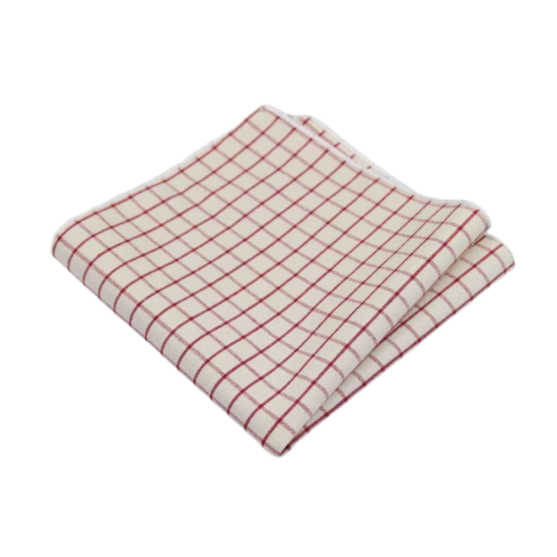 Doplňte svůj outfit moderního gentlemana o stylový kapesníček do saka Mřížka, který má červené linky uspořádané do čtvercového vzoru na bílém bavlněném podkladu.