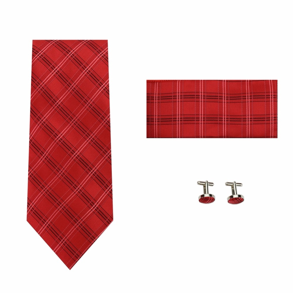 Červeno - černý set kravata, kapesník a manžetové knoflíčky Check