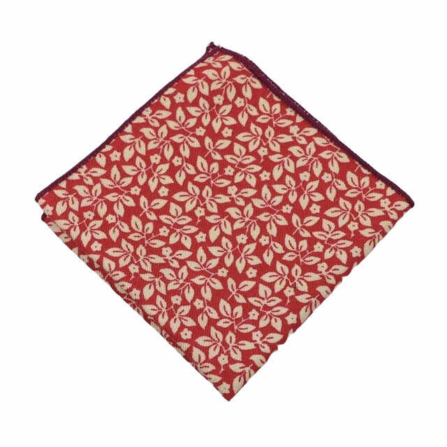 Kapesník je potištěn listy květin a doplněný kontrastním rudým obšitím.