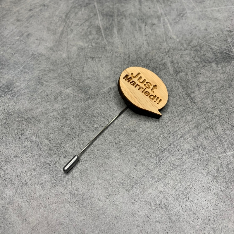 Originální a stylová pánská dřevěná brož s textem Just Married!!