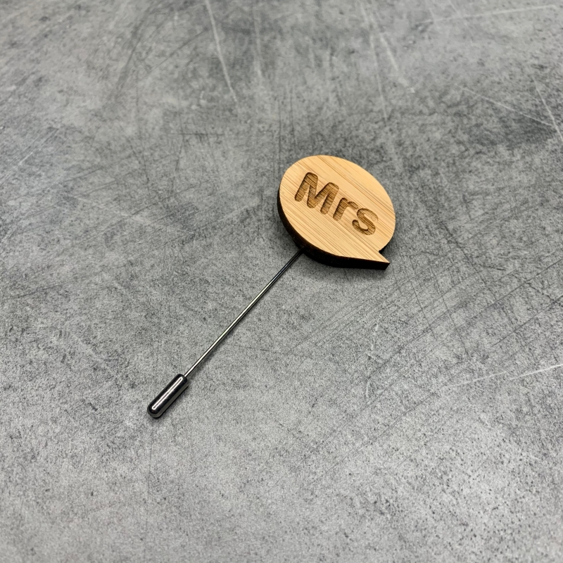 Originální a stylová dámská dřevěná brož s písmeny Mrs - paní.
