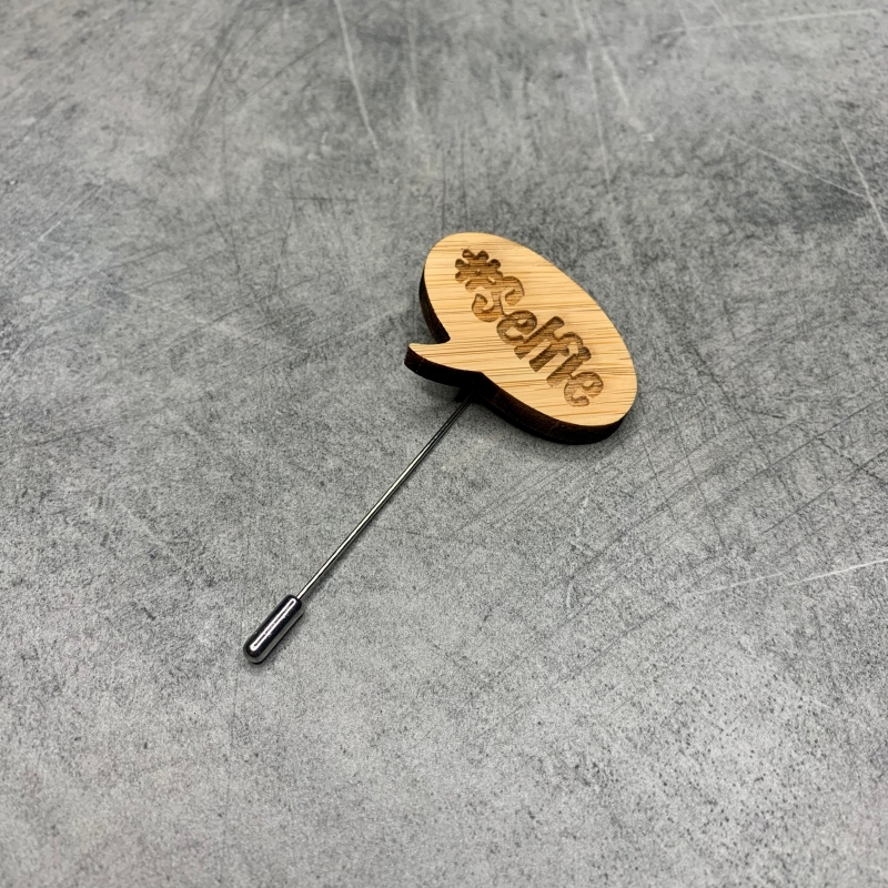 Originální a stylová pánská dřevěná brož s hastagem Selfie.