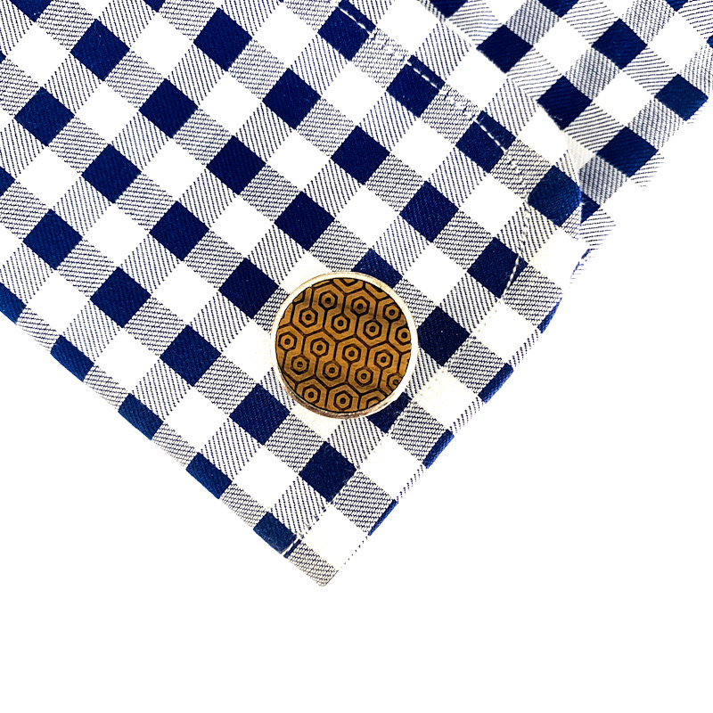 Manžetky jsou ve tvaru kruhu a uvnitř je vloženo strukturované dřevo s vygravírovaným geometrickým obrazcem, který připomíná mozaiku.