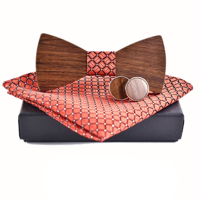 Popis: Krásný, elegantní a vyjímečný pánský dřevěný set složený z kulatých dřevěných manžetových knoflíčků, dřevěného motýlku Classic Shape a kapesníku se stejným vzorem jako je na středu motýlku.