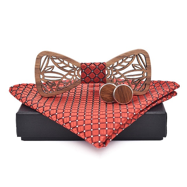 Nyní to budete mít na dřevo jisté, že dřevěný motýlek, manžetové knoflíčky a kapesník do kapsičky saka budou k sobě ladit.