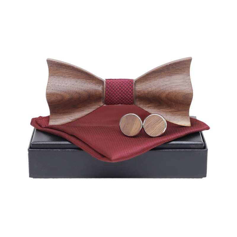 - Dřevěný červený set motýlek Sharp 3D + manžetové knoflíčky + kapesník