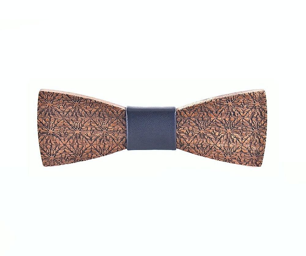 Popis: Dřevěný pánský motýlek Floral má vygravírovaný květinový vzor s černým koženkovým středem.