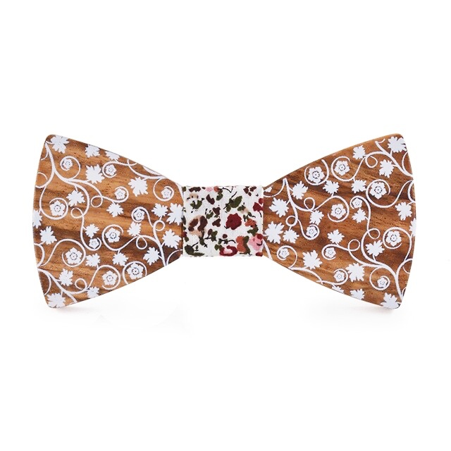 Popis: Dřevěný pánský motýlek Flower je potištěn bílým ornamentem květin a doplněný květinovou stuhou.