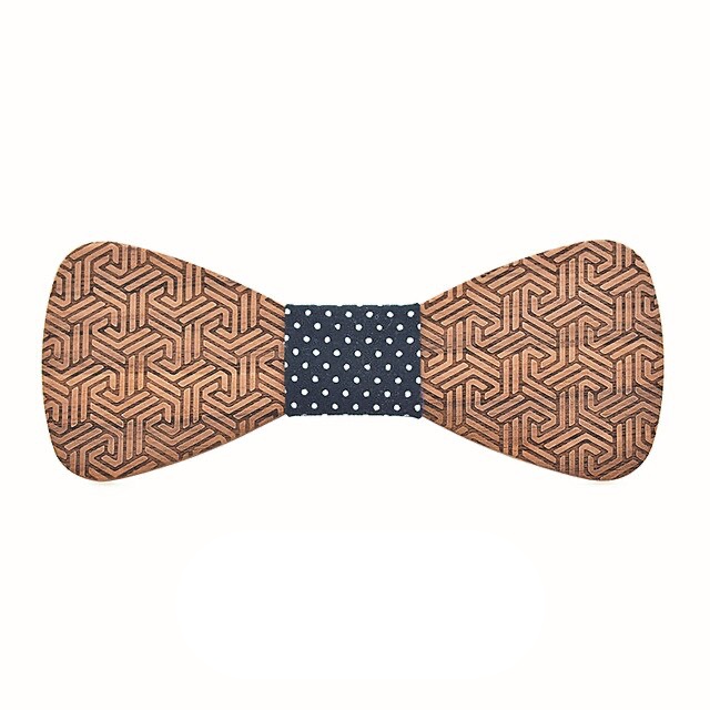 Popis: Dřevěný pánský motýlek Geo má vygravírované geometrické vzory s černo - bílým puntíkovaným středem.