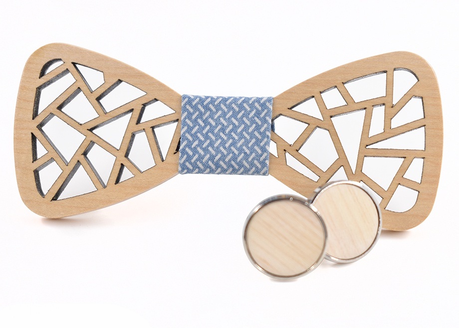 Dřevěný set složený z dřevěného motýlku Geometric, který má vyřezané geometrické tvary v těle a manžetové knoflíčky Javor jsou ze stejného dřeva.