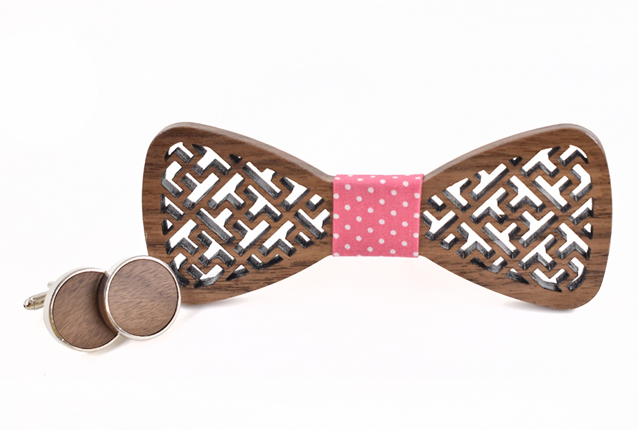Dřevěný set složený z dřevěného motýlku Labyrint, který má vyřezané geometrické tvary v těle a manžetové knoflíčky Ořech jsou ze stejného dřeva.