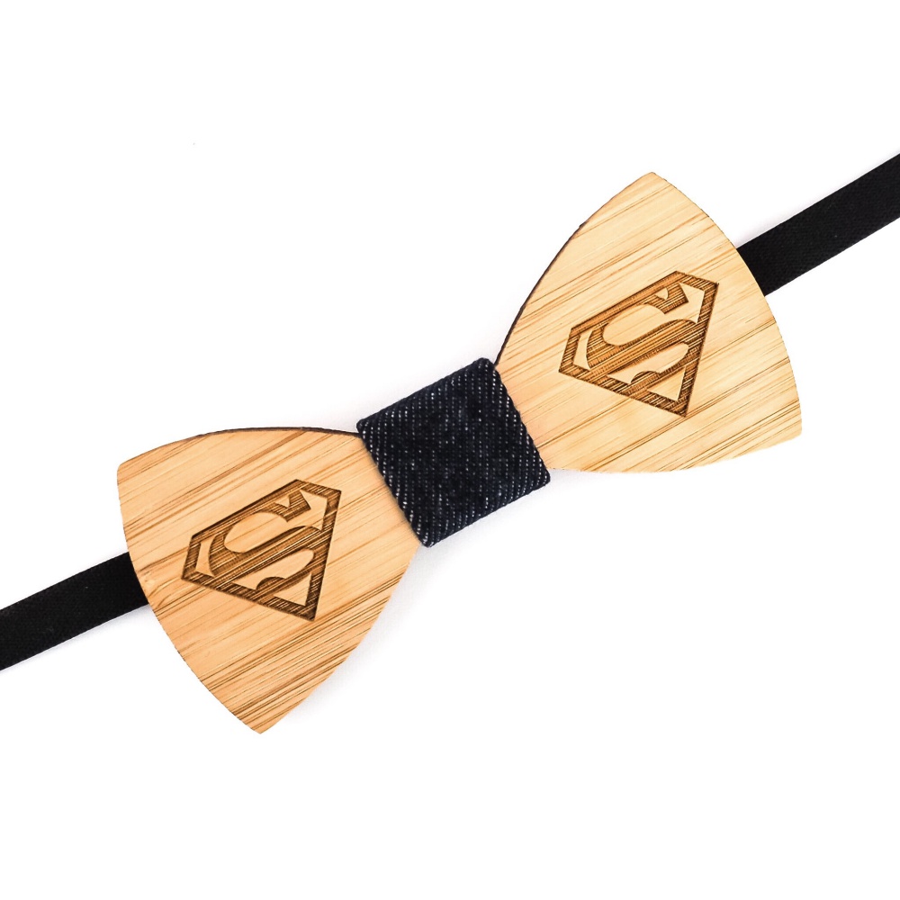 Popis: Originální a vysoce stylový dřevěný motýlek Superman logo s denimovým středem.