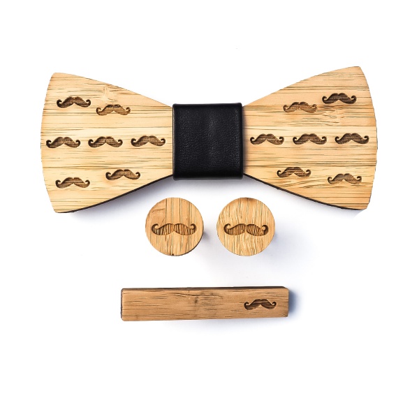 Praktický set je složený z dřevěného motýlku, který má po celé přední straně vygravírovaný švihácký knírek.