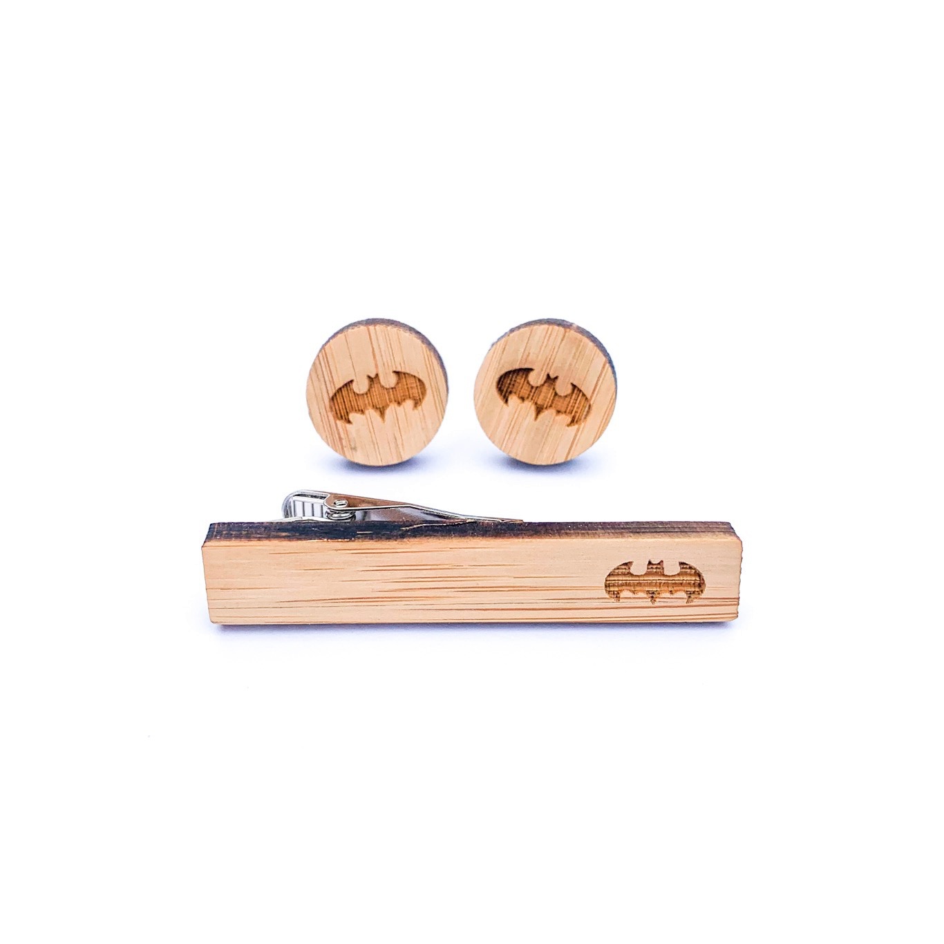 Dřevěný set - spona na kravatu a manžetové knoflíčky Batman logo