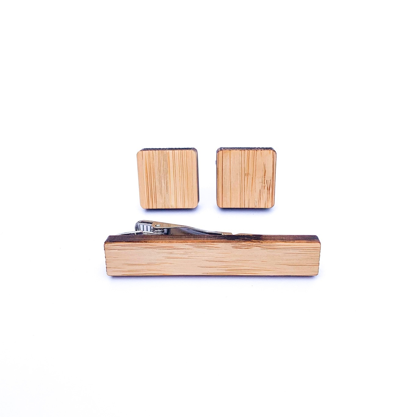 - Dřevěný set - spona na kravatu a manžetové knoflíčky Čtverec