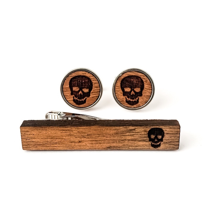 Dřevěný set - spona na kravatu a manžetové knoflíčky Wood Lebka