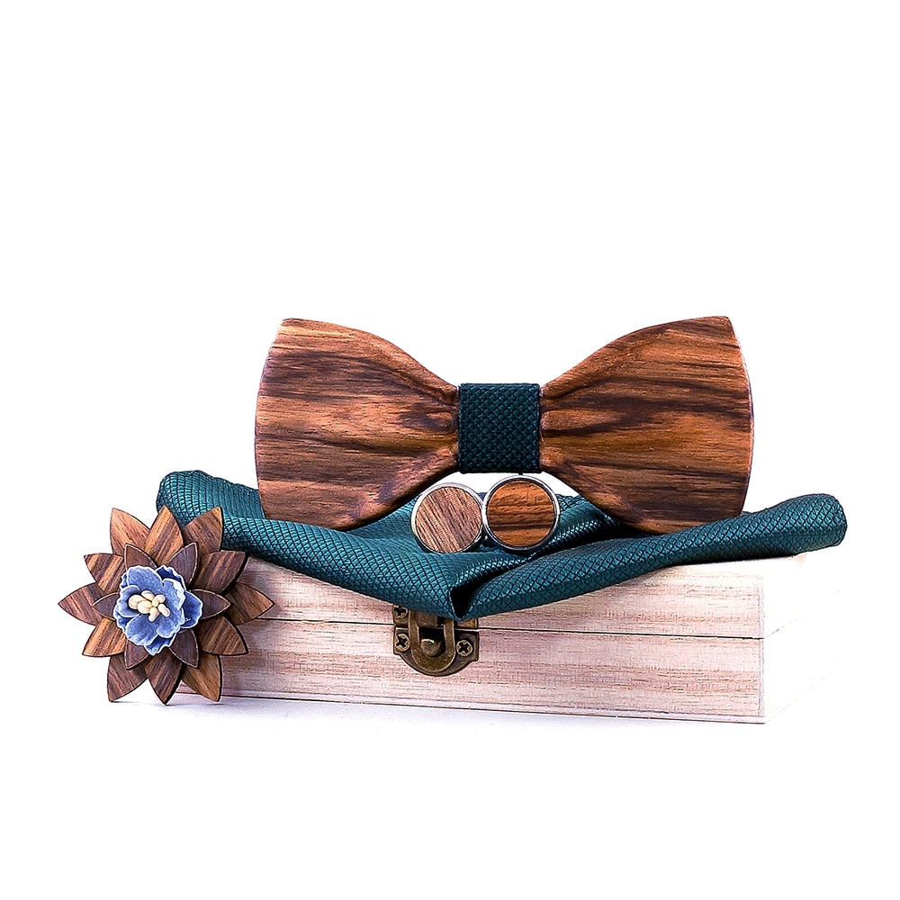 - Dřevěný zelený set - motýlek Classic 3D + manžetové knoflíčky + kapesník + brož