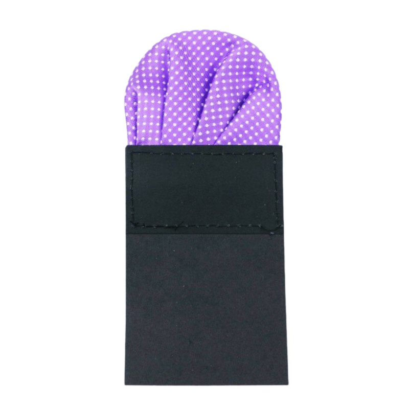 Popis: Stylový již složený a naaranžovaný fialový kapesník do kapsičky saka s bílými puntíčky.
