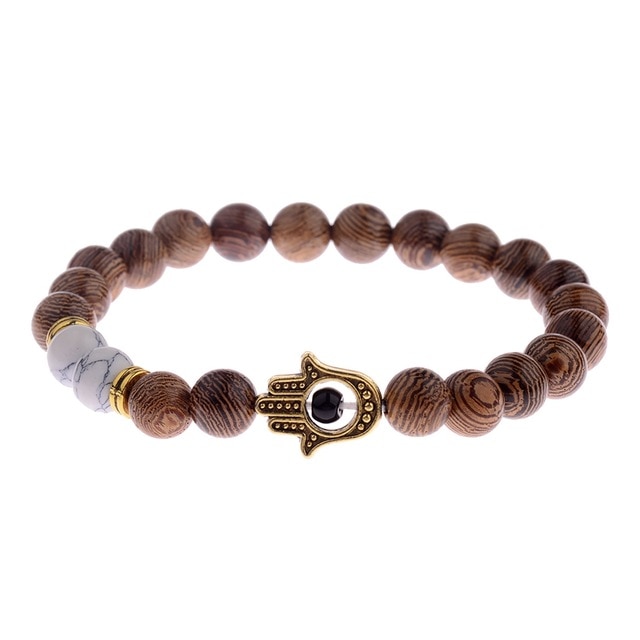 Popis: Stylový módní pánský a dámský dřevěný náramek Fatimina ruka vyrobený z dřevěných korálků, bílého tyrkysu a doplněný zlatým božím okem v dlani.